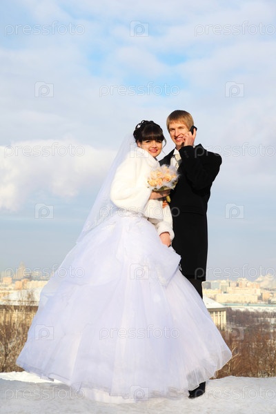 Счастливые жених и невеста с букетом роз обнимаются и смотрят на камеру