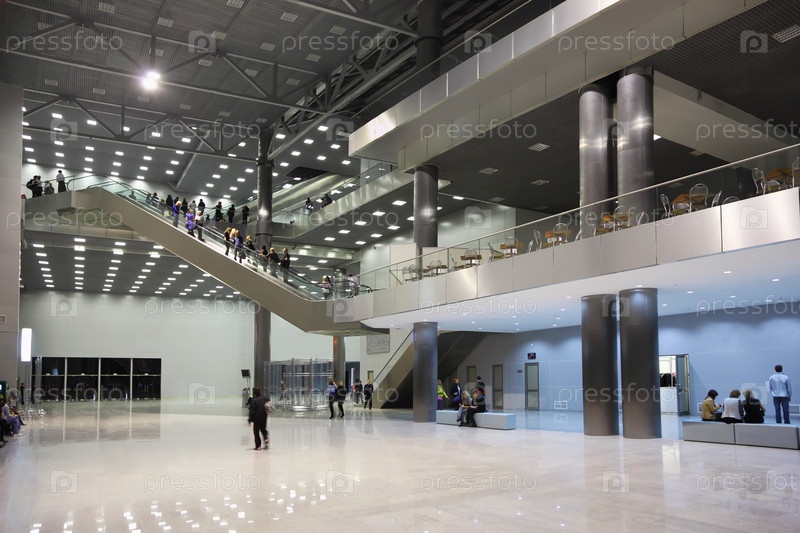 Люди стоят и ходят в вестибюле, на эскалаторе и на втором этаже внутри
