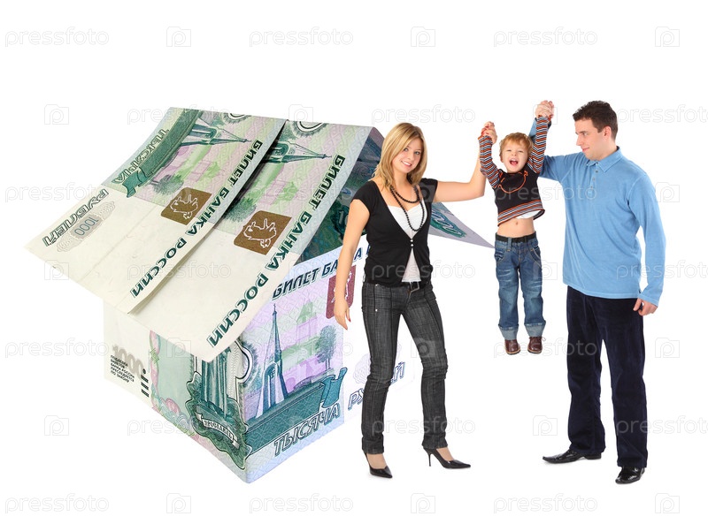 Семья стоит рядом с домом из банкнот