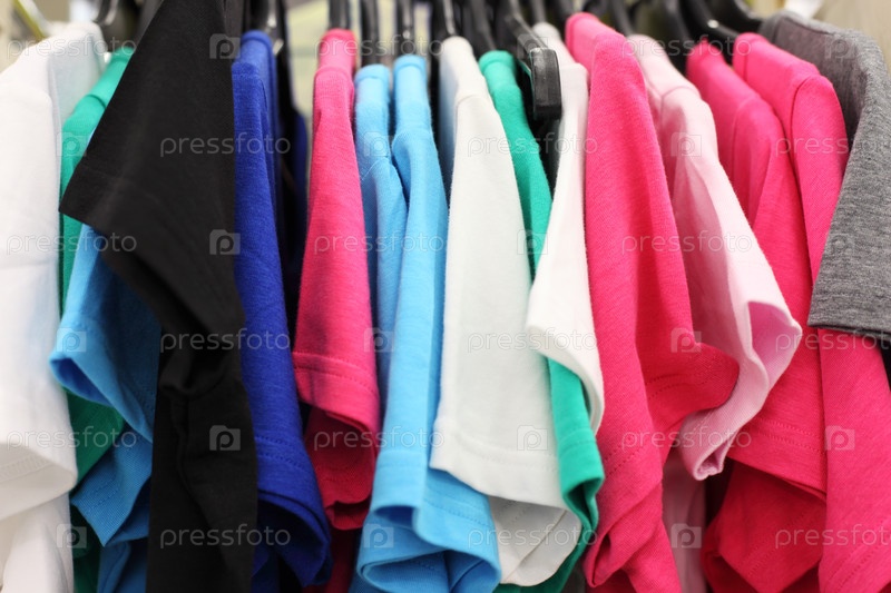 Разнообразие разноцветной повседневной одежды в магазине; футболки висят на