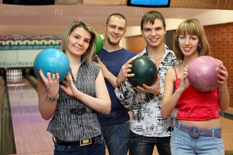 Два парня и две девушки стоят в клубе и держат мячи для боулинга, сосредоточьтесь на друге слева