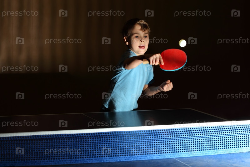 Маленький мальчик в синей рубашке, играющий в пинг-понг; сосредоточенное лицо;