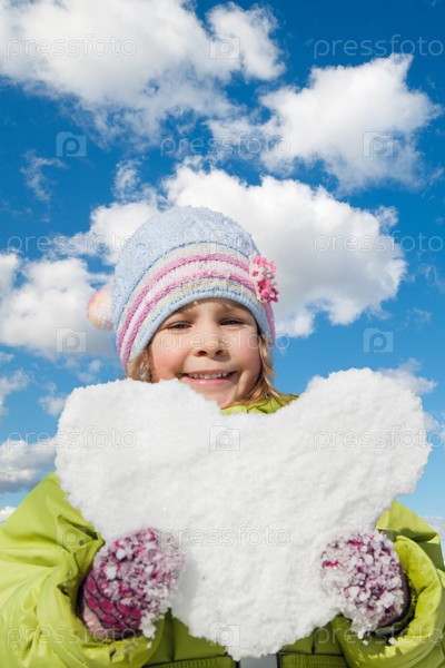Ребенок держит большое снежное сердце, ярко улыбаясь