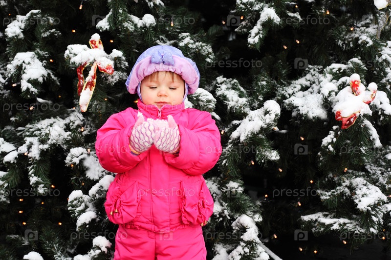 Улыбающаяся девочка в розовом куртке стоит возле зеленого дерева с