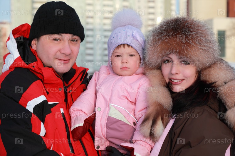 Мать и отец держали свою маленькую дочь, зиму, теплую одежду