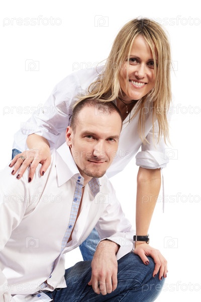 Улыбающаяся пара позирует на белом фоне