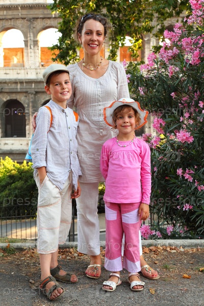 Мать и двое детей позируют вместе перед грандиозным древним сооружением