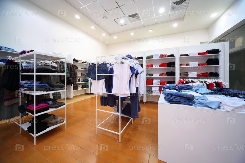 Женская одежда висит на демонстрационных стендах и лежит на полке
