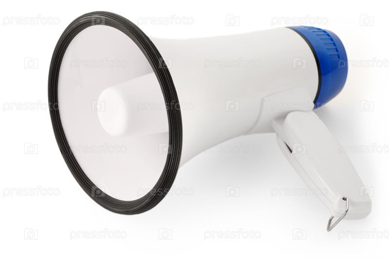 Белый мегафон с синей ручкой и черным полем