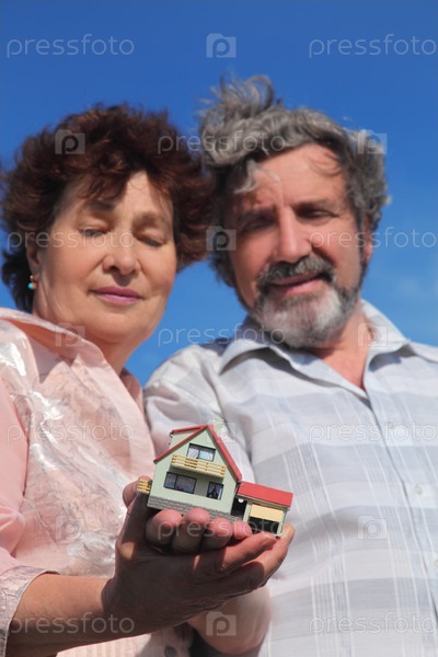 Старик и женщина держат маленькую модель дома, голубое небо, сосредоточьтесь на