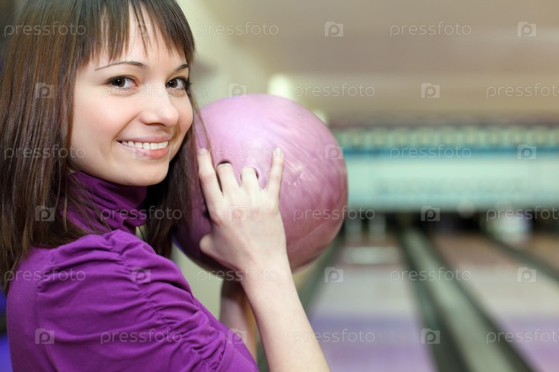 Молодая женщина улыбается, держа розовый мяч для боулинга