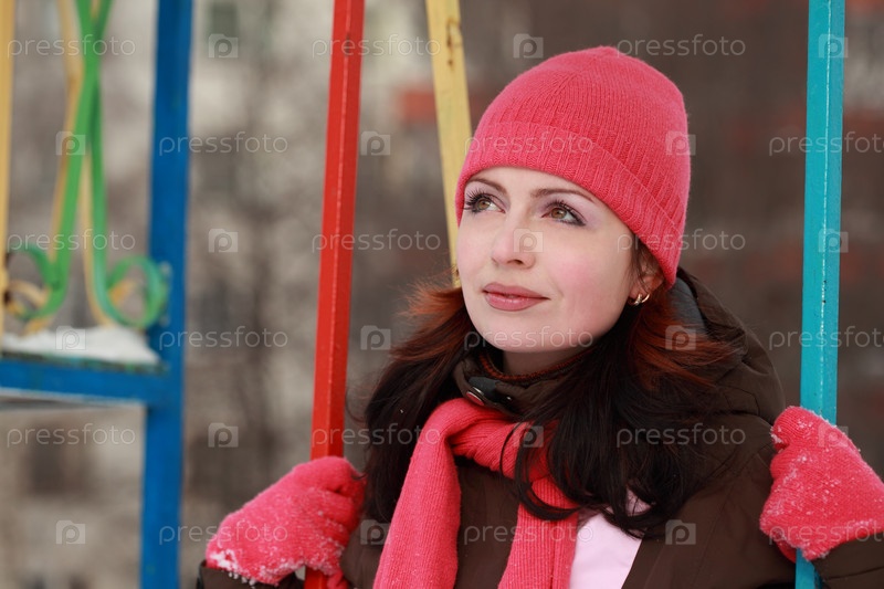 Красивая молодая женщина в розовой шляпе сидит на качелях зимой, дети