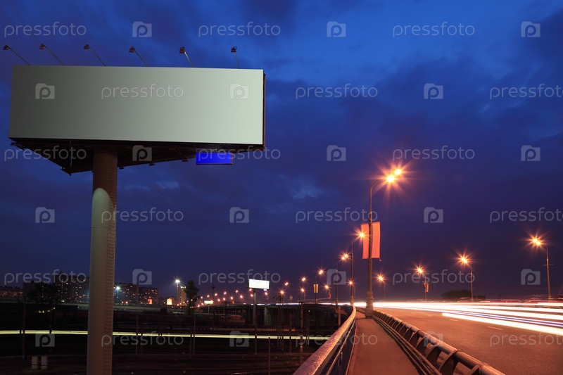 Большой серый рекламный щит с освещением ночью, дорога, мост и