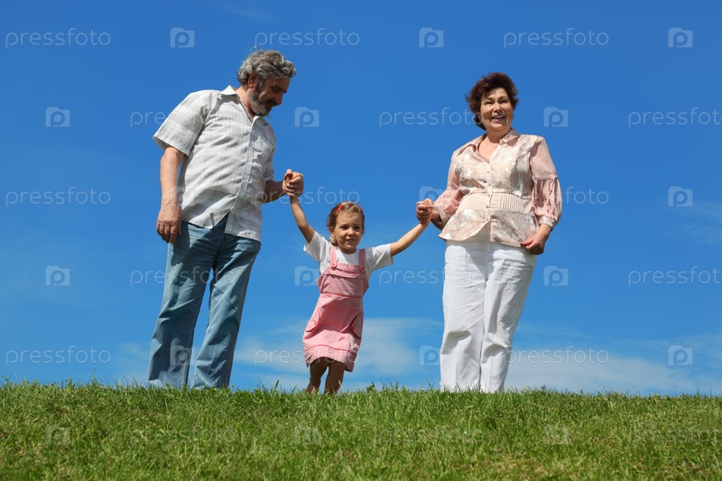 Маленькая девочка и ее бабушка с дедушкой стоят на лужайке, улыбаются и держат