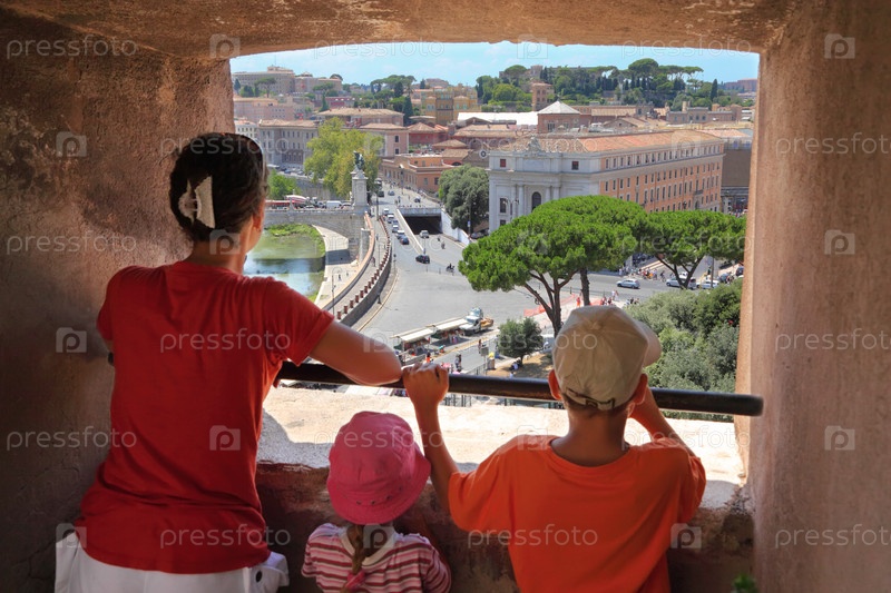Молодая красивая мать, сын и дочь смотрят в окно