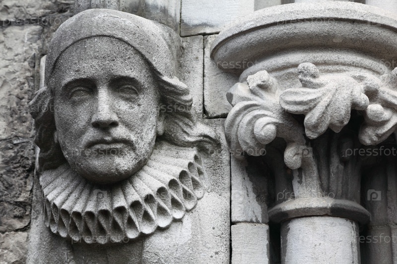 Каменная резьба изображает историческую фигуру в периодной одежде