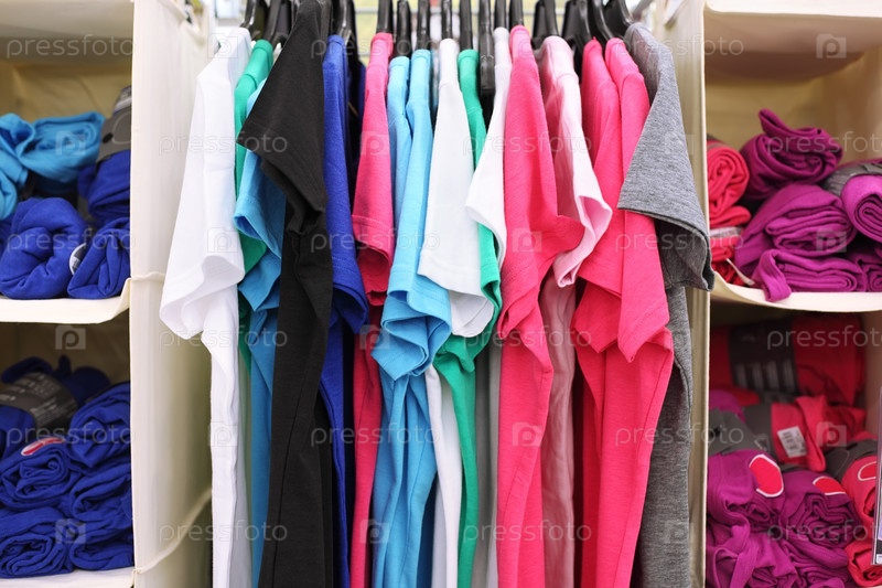 Разнообразие разноцветной повседневной одежды в магазине; футболки висят на стеллажах