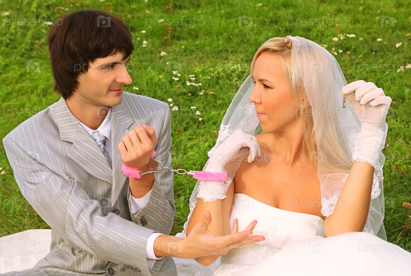 Красивый молодой жених и невеста в белом платье сидят на зеленом