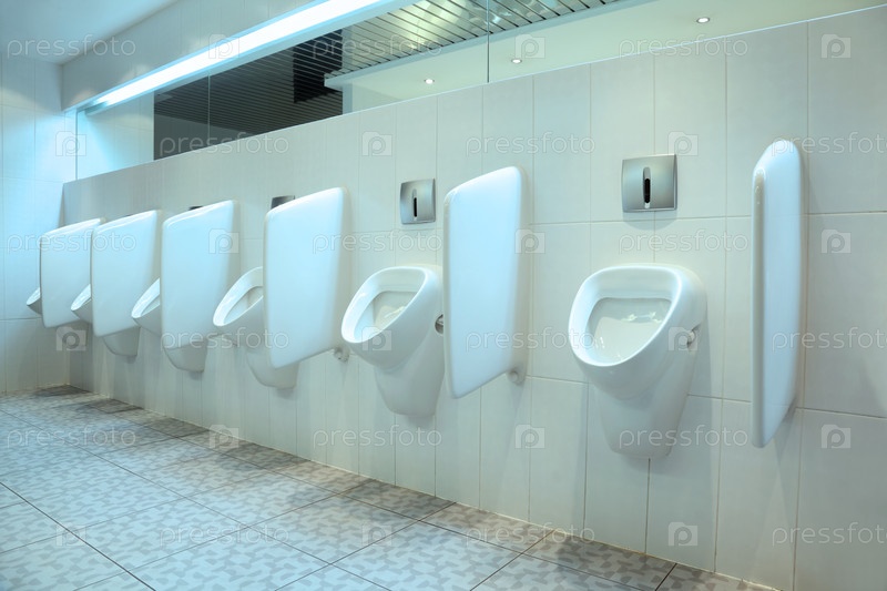 Современная ванная комната с белыми мочевыделками и плиточными стенами