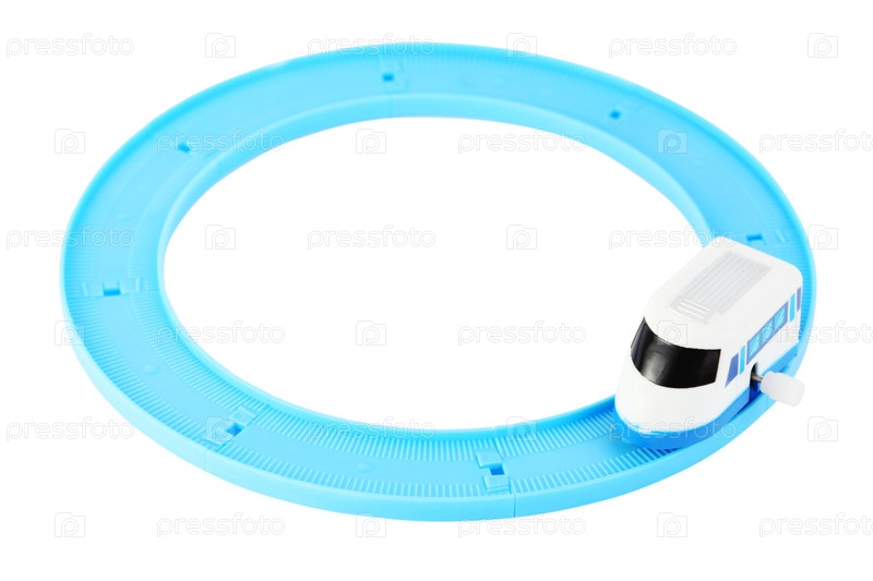 Часовой игрушечный белый поезд с синими яркими окнами на круговой
