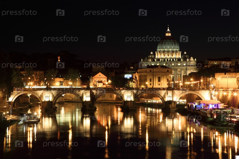 Мост Сан-Анджело и базилика Святого Петра ночью в Риме, Италия