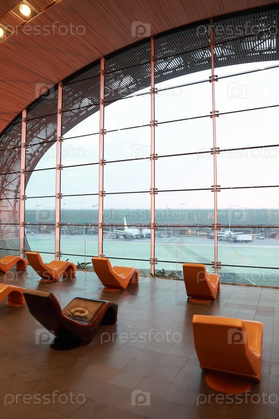 Зал ожидания в международном аэропорту с оранжевыми губчатыми стульями, сосредоточьтесь на окне