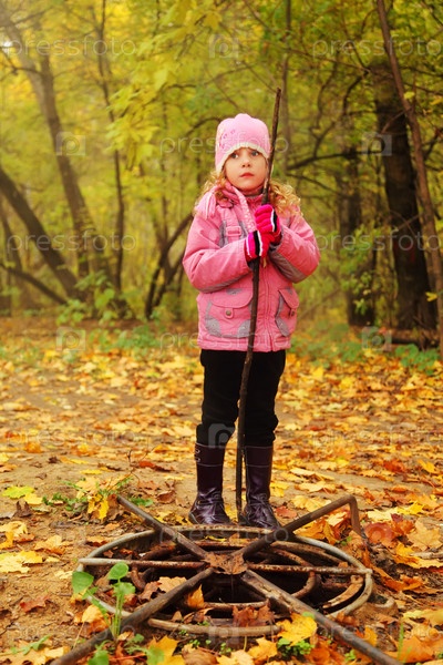 Маленькая девочка стоит в осеннем лесу с упавшими листьями