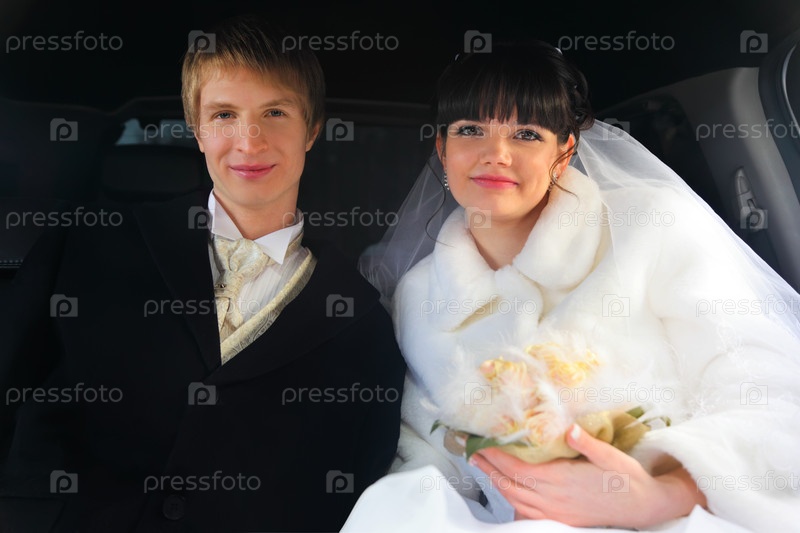 Улыбающиеся жених и невеста с букетом сидят внутри свадебного лимузина