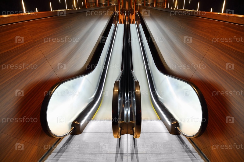 Современные эскалаторы с полированным металлом и деревянной отделкой