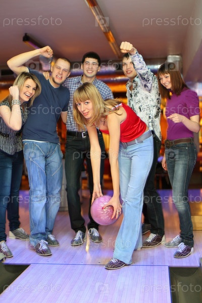 Девушка готовится бросать мяч в боулинг-клубе, и друзья его поощряют
