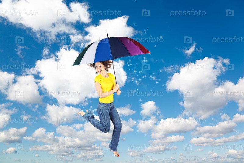 Летающая женщина с радужным зонтиком на белом, пушистые облака в голубом небе