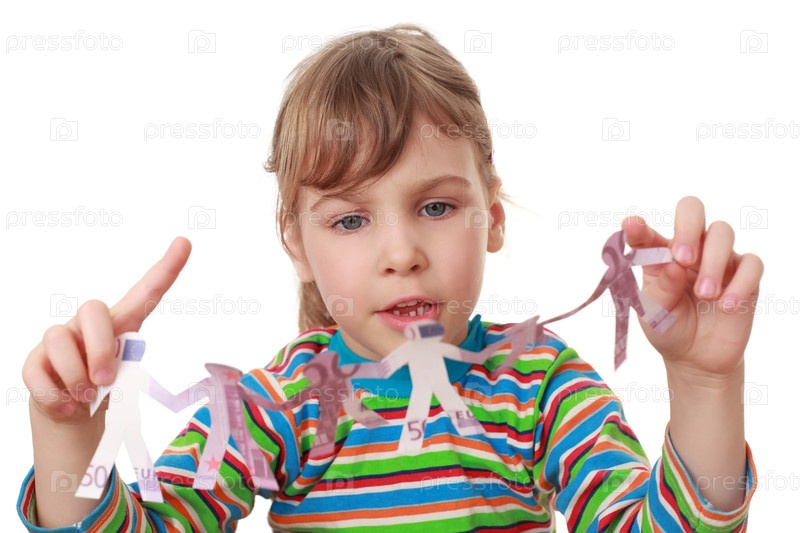 Красивая девочка в полосатой рубашке играет с гирляндой из бумаги