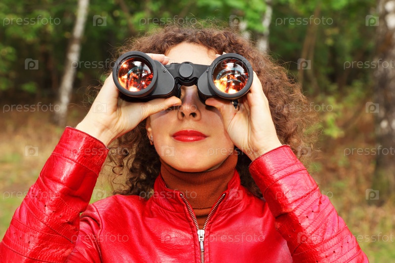 Лицо красивой молодой женщины, одетой в красную куртку, выглядит сквозь