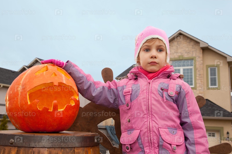 Маленькая девочка стоит рядом с резной тыквой