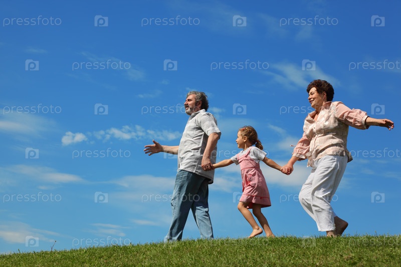 Маленькая девочка и ее бабушка с дедушкой бегут по холму, держась за руки