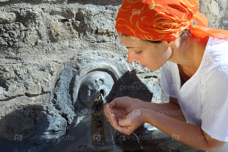 Красивая молодая женщина в красном платочке пьет воду из маленькой кастрюли
