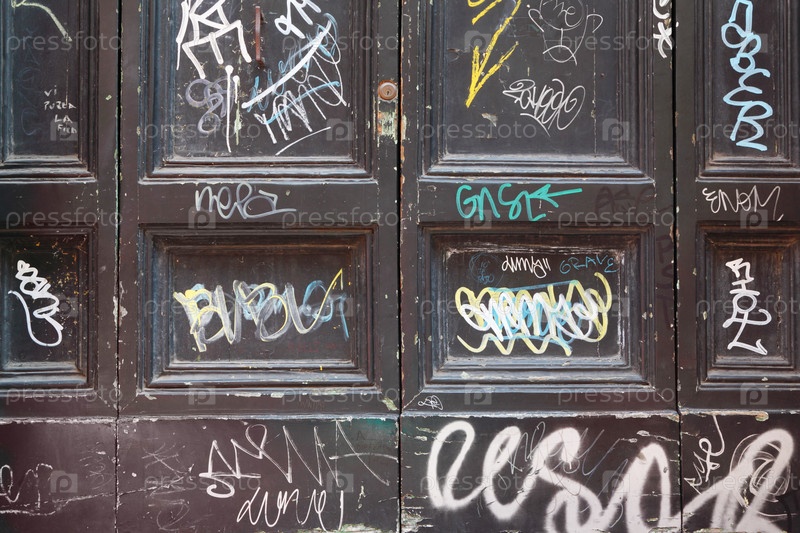 Проветриваемые деревянные двери, покрытые красочными граффити