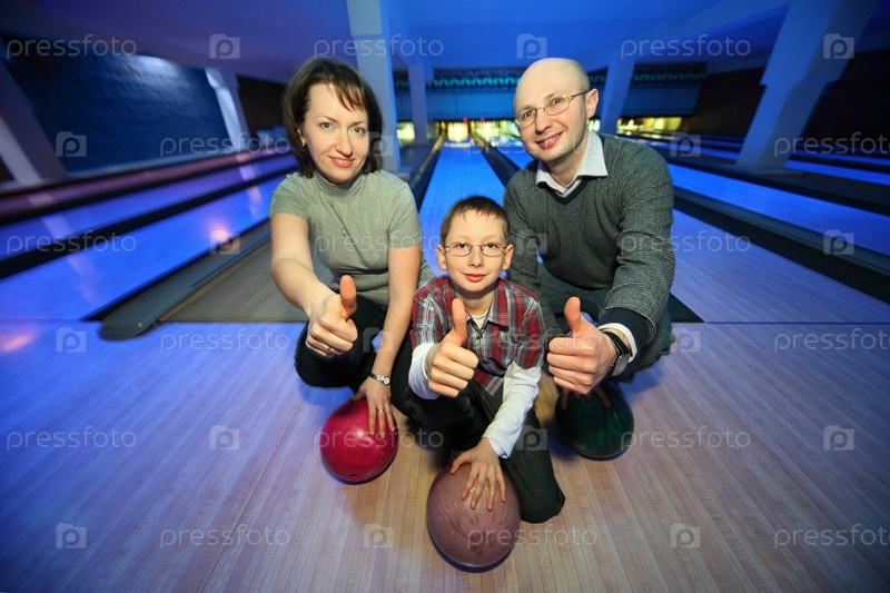 Семья приседает в боулинг-клубе и показывает руки ОК, сосредоточьтесь на