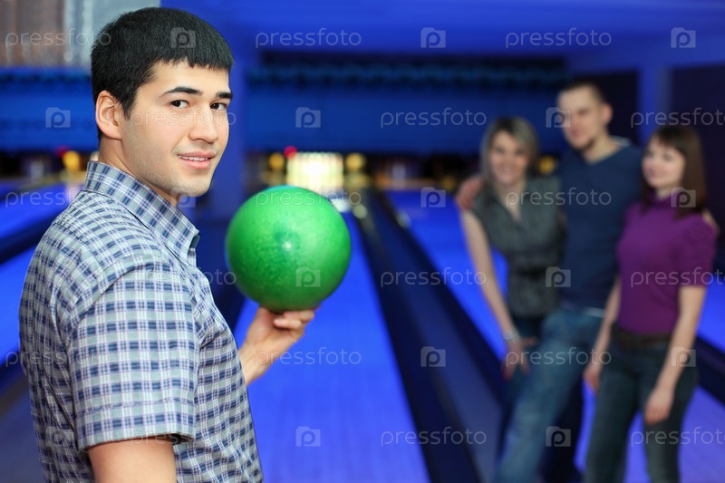 Один парень стоит в сторону и держит мяч, чтобы играть в боулинг и