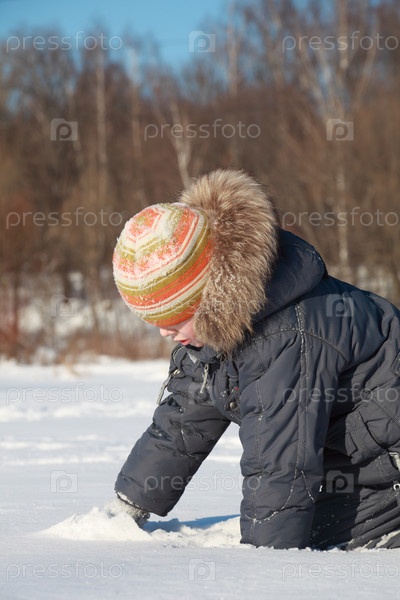 Ребенок на коленях в снегу, одетый в уютную зимнюю шляпу и пальто