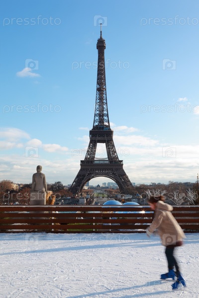 Женщина катается на коньках, Эйфелева башня зимой в Париже, Франция