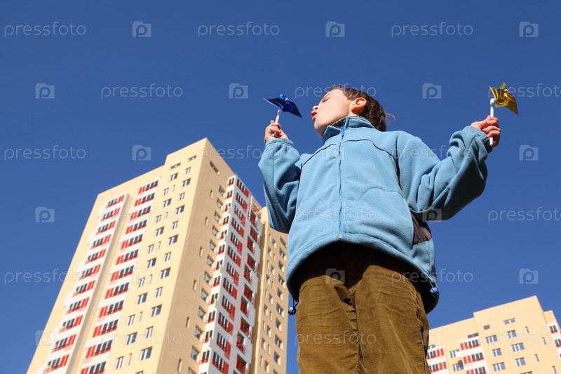 Маленький мальчик в синей куртке дует на штыковые колеса в руках
