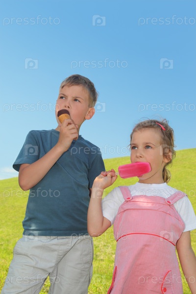 Маленький мальчик и девочка едят мороженое, голубое небо и зеленая лужайка, сосредоточьтесь