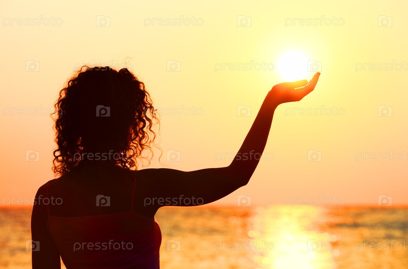 Красивая молодая женщина стоит на пляже, смотрит на закат, держит солнце
