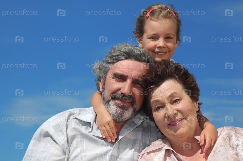 Бабушки и дедушки обнимают девочку на свежем воздухе под чистым голубым небом