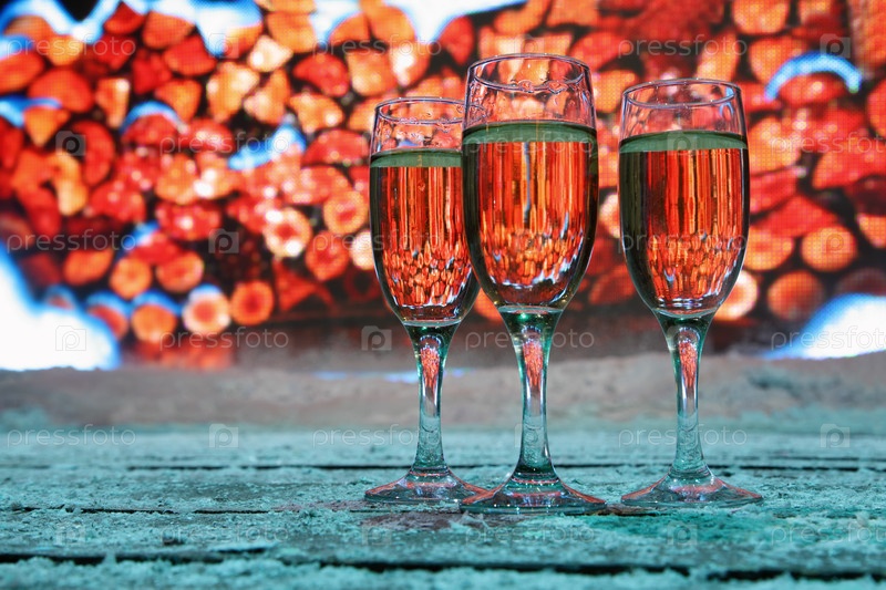 Три бокала шампанского стоят рядом с большим экраном, на нем куча древесины