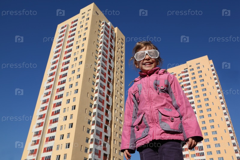 Красивая девочка в розовом куртке и большие белые очки, две желтые