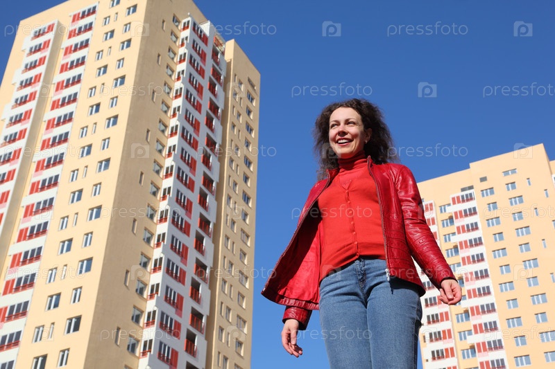 Молодая женщина в красной куртке и синих джинсах улыбается, две красивые