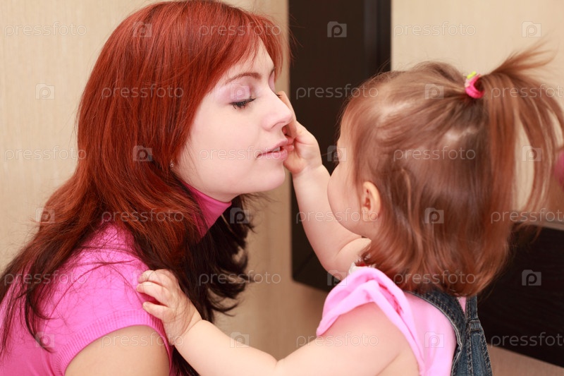 Мать нежно позволяет ребенку прикоснуться к ее лицу