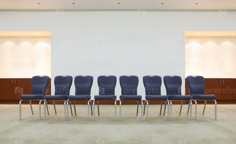 Ряд удобных серых стульев в светлой комнате ожидания; серый потолок и